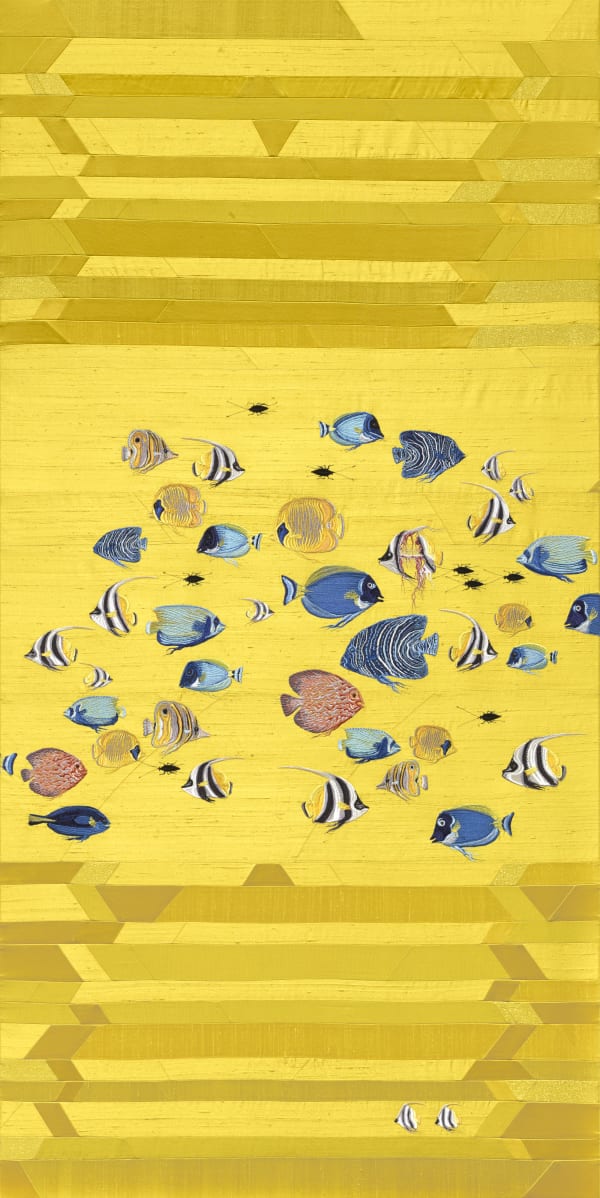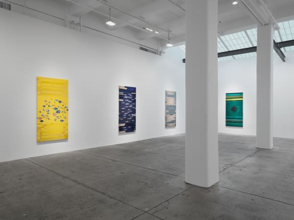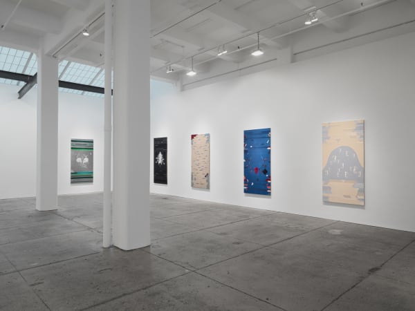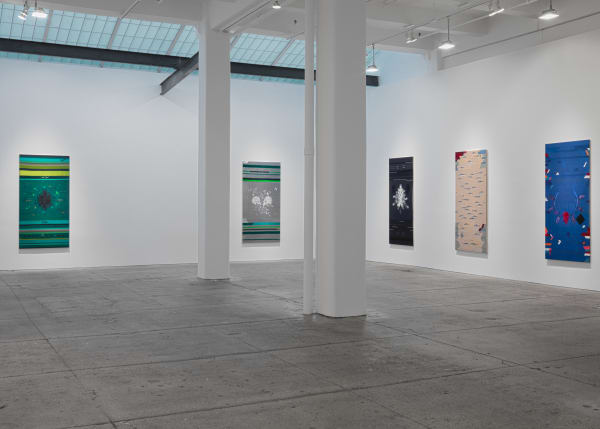 Galerie Lelong is pleased to present The House of Magic Affection, an exhibition of intricately designed and embroidered paintings by Italian artist Angelo Filomeno. Over a dozen recent paintings will fill the main gallery, paired with a series of intimate works on linen in the gallery’s project space. Highlighting Filomeno’s technical and aesthetic skill in merging painting, embroidery, and craft, his unique visual language is presented through a variety of rich materials including silk, crystal, and metal. In a departure from his last exhibition, Filomeno introduces a serialism not seen in his previous bodies of work, an expanded use of color and materials, including muslin, and a variety of characters that have never before been incorporated into each of the hand-made canvases. The artist will be present for the opening on Thursday, December 18 from 6-8PM.