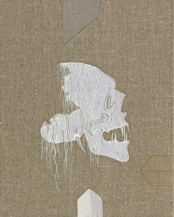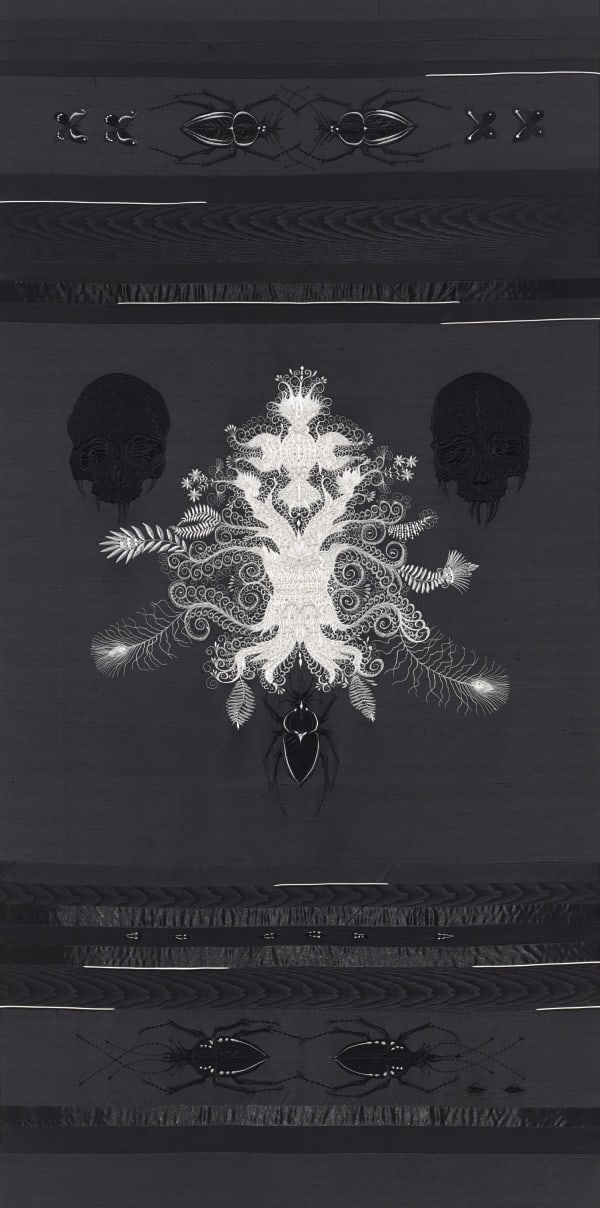 Presenting immediately alluring, albeit complex, imagery has long been the foundation of Filomeno’s work in his exploration of themes such as death, destruction, isolation, and obsession. Drawn from and aligned with the artist’s personal history, Filomeno’s work as a child apprentice to a clothes tailor still informs his intricate technique and production as both art and skilled craft. Often blending elements from his personal history with his fantastical imagery, the exhibition’s title, The House of Magic Affection, references the artist’s childhood home.