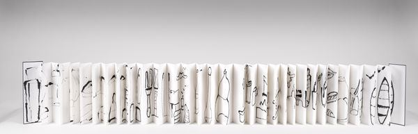 A new series of leporellos will be presented. They are named after Erquy, a small commune in Brittany, northwestern France where Adnan and her longtime partner Simone Fattal had spent their summers. In 2021, they were interviewed by Hans Ulrich Obrist from their seaside apartment, with Adnan remarking how the commune is a straight line on the sea from her window. Fattal, in response, had shared how Adnan was so “impregnated by this straight line” that she would make a leporello each day, looking at the rocks, trees, surfers, and other people on the beach.