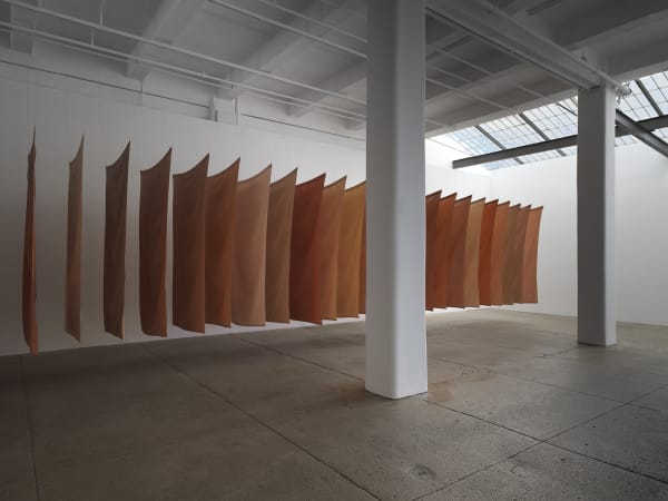 A set of 50 flags will hang vertically in a linear form along the walls of the gallery. As the viewer walks this line, different qualities of red emerge, referencing the embedded layers of the landscape and the people who have gone before. The line is a constant investigation in Goldsworthy’s practice, and it appears once more, with the flags becoming a single flowing work of canvas, earth, color, stillness, movement, and humanity. The original reds of the flags have also been changed by the weather conditions they experienced; an additional layer hidden but always present. By examining the contexts of flags and their connections to land and geography, their inherent and potential meanings are evoked in these varying qualities of red earths.