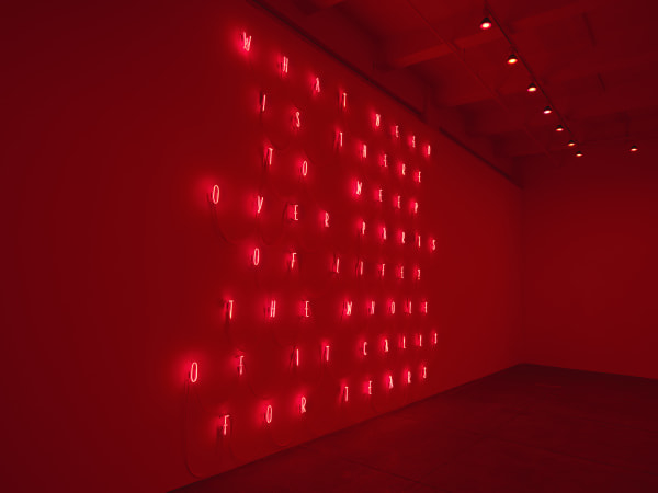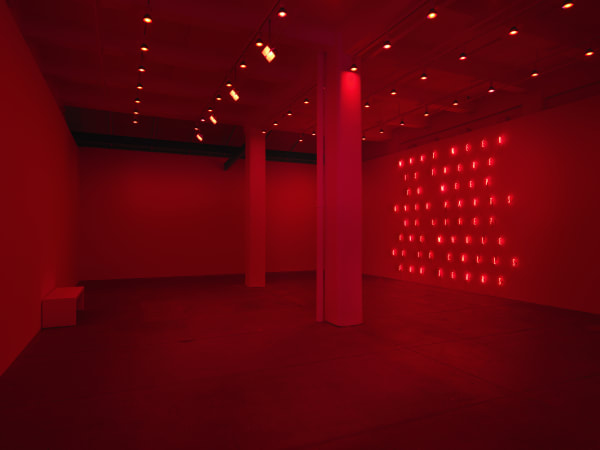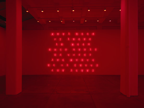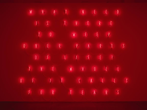 In the gallery’s main space, an immersive experience is created with a large, red neon work. The words of the stoic philosopher Seneca take center stage—"WHAT NEED IS THERE TO WEEP OVER PARTS OF LIFE? THE WHOLE OF IT CALLS FOR TEARS.” Seneca strongly believed that if we have the essentials and a strong inner spirit, we can radically accept and endure any circumstances. Eschewing the presence of other objects, the room is entirely illuminated with a dense red light, building an atmosphere of poetic uncertainty, mirroring the unease of contemporary times. The philosopher’s emblematic phrase glimmers in the space, reacting to the tyranny of the white box space and filling it with an idea—a model for thinking about the world.