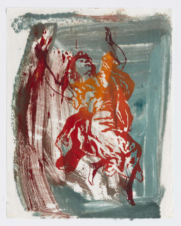 In the largest work on paper in the exhibition, Relay (2000), Spero arranges the sweeping narrative in a series of smaller vignettes. Figures appear repeatedly against an ever-changing background; variations in color and pattern alter the viewer’s perspective and create a sense of dimensionality within the work. The size and spatiality of Relay reflect Spero’s unique approach to her signature medium, paper. Spero observed that painting was “too conventional, too establishment” and relished the freedom she found in the ephemeral quality of paper.