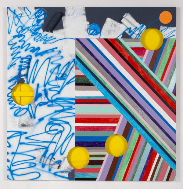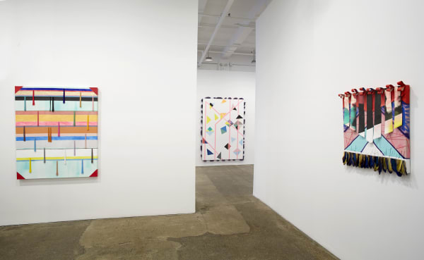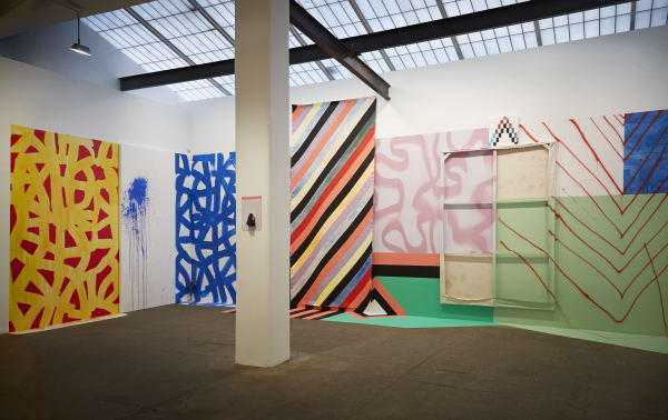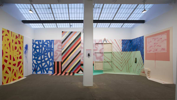 As Sarah Cain deconstructs and reconstructs her canvases, she reveals the physical structure of her work while working outside the confines of the canvas and breaking free from the limitations of the frame. Though the diversity of her materials make each work unique, Cain’s practice is unified through her meditative, of-the-moment, and personal approach to transforming the individual experience into a universal poetry. Direct and confrontational at times, Cain uses color and form to activate the space within and around the work, creating a body to canvas relationship between the maker and the viewer.