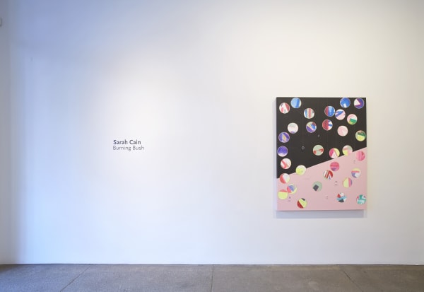 Abstraction has always represented a space of freedom within Cain’s hands. Similarly, words attached to her paintings become material in the same way that a found object melts into the paint. The show’s title, Burning Bush, is a continuation of Cain’s interest in the mystic. Cain has previously informed her practice from The United Society of Believers (the Shakers), tantric painting, and has created a large-scale installation in Marfa, Texas in a former Masonic lodge. Repurposing the words “Burning Bush,” Cain relates to its symbolism of the burning heart of purity, love, and clarity, as her painting practice is fundamentally about seeking truth. Like many of her chosen words, a double-sidedness to the phrase “Burning Bush” comically and consciously also embodies Cain’s feminist stance.