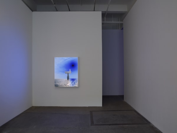 Equally captivating and alluring, Yass’s series of surreal lightboxes draw the viewer into abstracted images of the structure. In this new lightbox series, Yass continues her signature technique of laying a photographic color transparency over a blue negative transparency, taken about 5 seconds apart. As a result, the areas that reflect light come out in vivid blue and the intensity of the sun is shifted to black, as seen in Lighthouse (East), 2011.