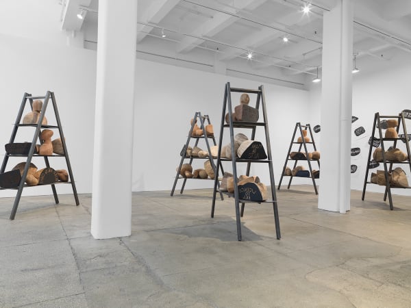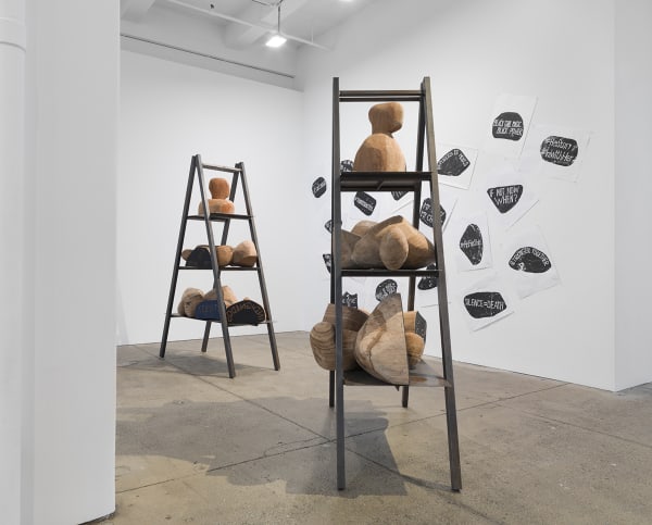 A Cameroonian artist based in France, Toguo focuses his multimedia practice on notions of exile and belonging. Urban Requiem (2015) presents an arrangement of ladders weighed down with wooden portrait busts. Carved into their flat bases are slogans sourced from recent protests and national movements, from #MeToo to #BlackLivesMatter, allowing each sculpture to function as a stamp. The process of utilizing each stamp parodies administrative gestures, as they require significant effort to lift and coat with black ink before making a thickly crusted mark on paper.