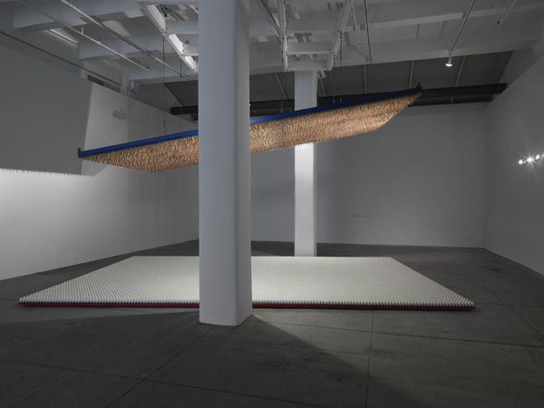 The centerpiece of Meireles’s presentation at Galerie Lelong will be Amerikkka (1991/2013), the work’s first presentation in the United States. Transforming the gallery into a powerful, interactive experience, the work places viewers under a free-standing ceiling angled at forty-five degrees that is composed of 40,000 hollow golden bullets set against an intense blue background. Viewers stand upon a base of over 20,000 white wooden eggs set into a red floor. Juxtaposing sharp bullets and fragile eggs, Amerikkkasimultaneously creates an uncertain and unsettled environment and calls into question whether the work is opening or closing, and if the threat of the bullets is real or perceived. The triple “K” in the title alludes to the Ku Klux Klan, the far right organization that espouses white supremacy and the use of extreme violence.