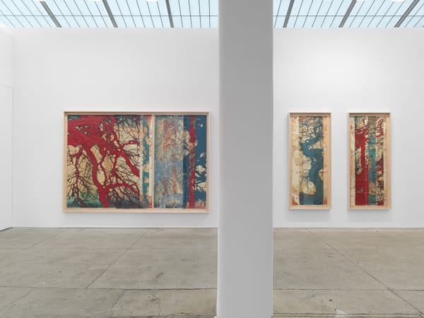 Doug and Mike Starn’s practice is atypical from other artists in the exhibition, consisting of a co-creation process that is almost a single gesture from a life-long collaboration in photography and most recently in sculpture, with Big Bambú. Working in a shared studio every day, it is not possible to tell where the hand of one ends and the other begins. Overlap and simultaneity, interconnection and evolution—fundamental aspects in their oeuvre—are continued in new works created for the exhibition from the ongoing No Mind, Not Thinks, No Things series. Collapsing the hierarchal tree structure by creating silhouetted images of branches to allow the free flowing connections to happen everywhere, the Starns mine images from extant work, composing and roughly cobbling together the colorful translucent images, tenuously interwoven and layered to represent the unceasing structure of thought. For the Starns, the taped and glued connective tissue is the same factor in the equation as the ropes connecting the bamboo poles in the random interdependence of the chaotic structures of Big Bambú. Inspired by Buddhism, the Starns select images to remake the past into something new. Interruption and interplay is constant. In the words of the Starn twins, “the discipline needed to achieve the No Mind is fought for.”