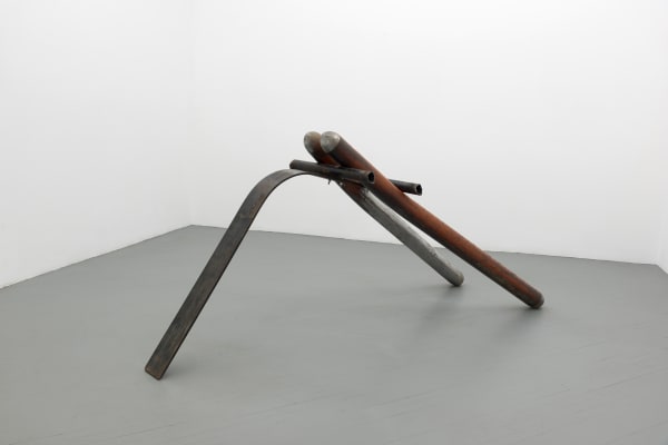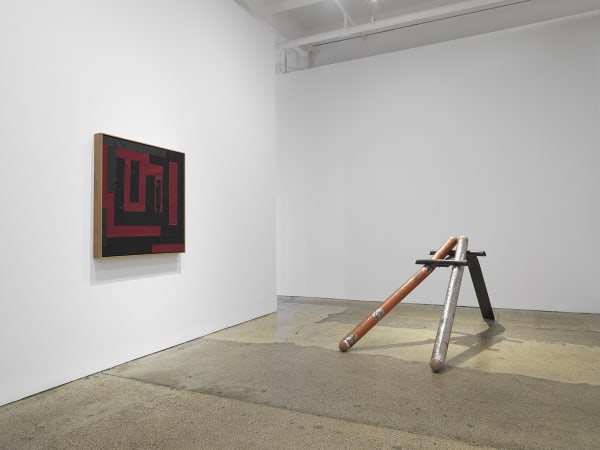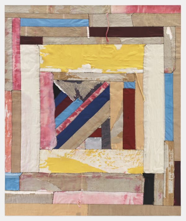 Jones further addresses the normalization of bodily abuse embodied by football gear. Several paintings are formed from footballs and blocking pads that have been dismembered and re-sutured. The sculpture Giant (2018) is constructed from steel that once constituted a tackling dummy that Jones used for high school football practice, recalling his own personal experiences of discrimination in addition to the racism in professional team sports more broadly.