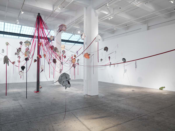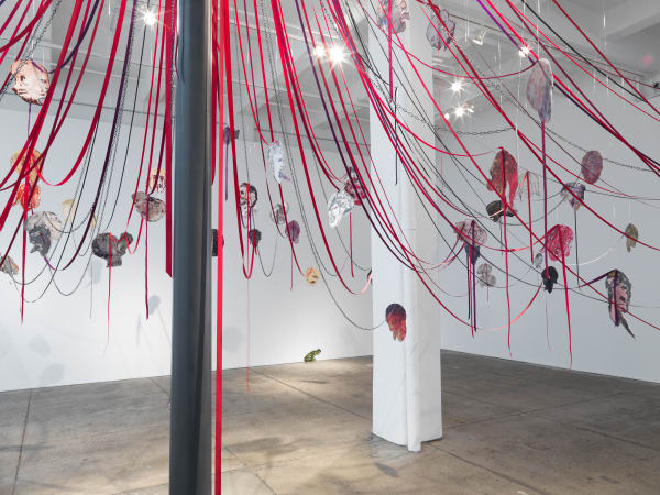 Maypole: Take No Prisoners was Spero’s final major work before her death in 2009. It synthesizes several themes that Spero explored throughout her influential, 50-year career and embraces the productive coexistence of anger and celebration. As a familiar centerpiece of traditional folk festivals, the maypole is presented as a continuation of Spero’s interest in “victimage,” a term she coined to describe the transition from victim to protagonist. Over 200 decapitated heads, printed on cut aluminum and hanging from ribbons and metal chains, carry expressions of emotional anguish. Many are derived from elements of drawings from Spero’s The War Series (1966-70), a body of work that confronts the dehumanizing horrors of the Vietnam War. The imagery of the sculpture directly references the war because, as Spero wrote: “In the 60’s in Vietnam they would cut off heads from corpses and put them on poles.” Created during the Iraq War, Maypole draws a direct line between the two wars that unfolded during her lifetime while calling for a broader examination of the universality of war as a tool for oppression. While considering the violent atrocities taking place decades after Vietnam, she angrily stated: “It’s absolutely the same, damn it.”