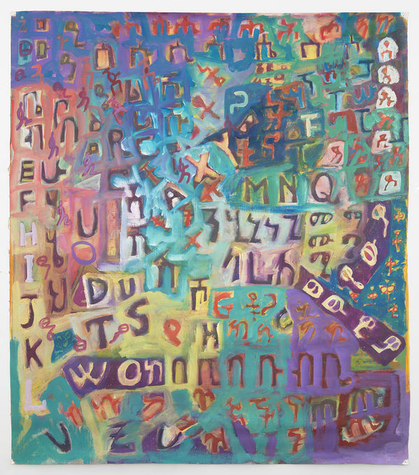 Through a bright, joyful palette, Ghebreyesus shifts seamlessly between abstraction and representation. The artist’s notable use of translucent layers of acrylic melds the people he met, the religions and cultures he was exposed to, and alphabets of the eight languages he fluently spoke onto the canvas. In Mangia Libro (c. 2011), a morphing land and seascape surround a boy in yellow who reads a book clutched in his hands. The figure seems to float in the dream-like composition comprising windows and passageways in the background, while a whorl of iridescent green in the foreground hints at a body of water with rich biodiversity emerging from its surface. A reference to Eritrean textiles conveyed through a vibrant checkerboard pattern is slightly hidden towards the side. The work’s title “mangia libro” means “book-eater” in Italian. Having been Ghebreyesus’s nickname as a child, the painting commemorates the promising student whose education was halted by war.