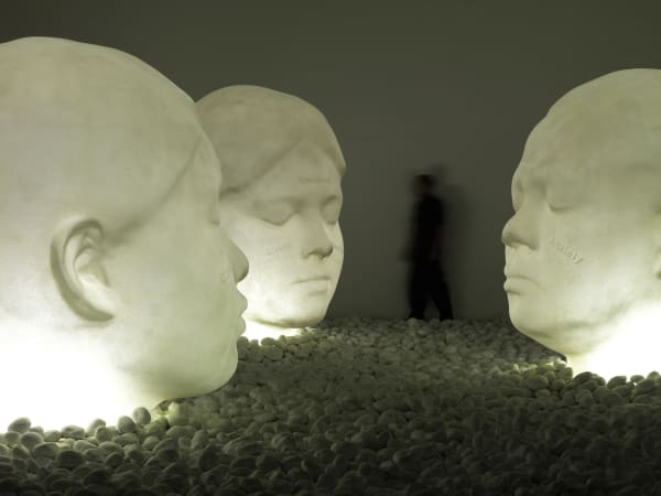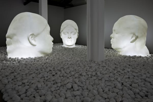 Three resin heads of women, illuminated from within with white neon and rising out of a blanket of white marble stones covering the floor, make up the central work in Jaume Plensa's upcoming exhibition In the Midst of Dreams at Galerie Lelong. The exhibition will open to the public on Thursday, September 10 from 6 to 8 pm. The artist will be present.