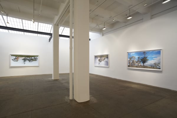 Throughout the past decade, on drives along the south coast of Australia, Laing has observed small country towns and farmlands fall victim to the socio-economic and environmental pressures of suburban development. For her new project leak, Laing chose the Cooma-Monaro District in New South Wales, an area that has been the subject of many Australian landscape paintings and the setting for several novels including The Twyborn Affair by Patrick White of which the titles of the leak photographs are based. During her research for the project, Laing also watched science-fiction films of aliens or mutants infesting the human race, noting similarities in the way in which man-made suburbia infests and spreads across the natural landscape. The combination of these various influences resulted in the careful construction of a skeleton of an upside down, single-family home set on a privately owned 3,000 acre sheep farm, dating back to the early 1900s. In Eddie (2010), the gloomy sky, eerie stillness, and haunting gum trees seem to foreshadow an impending doom around the erected structure. Paradoxically, Aristide(2010) depicts a flock of sheep with their herdsman under a beautiful blue sky, bewildering the viewer with the foreign object. The leak series culminates in Stavroula (2012), the first panoramic wall sized image by Laing, presented on a curved wall in the small gallery. Stavroula allows viewers to confront the