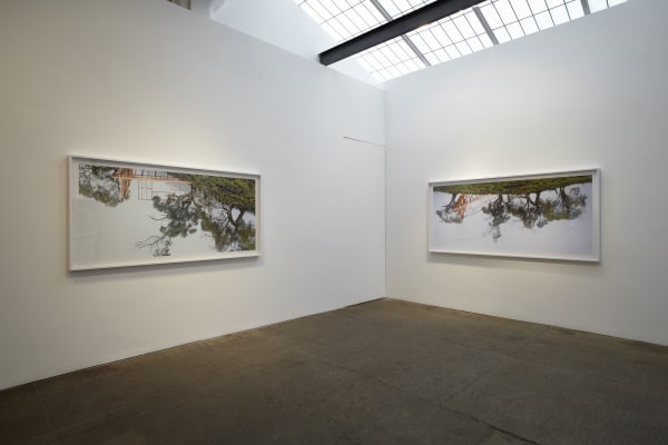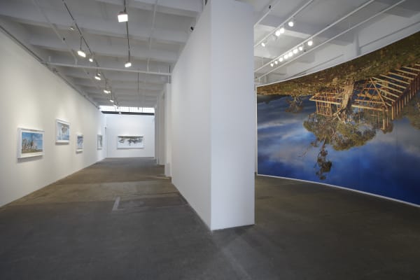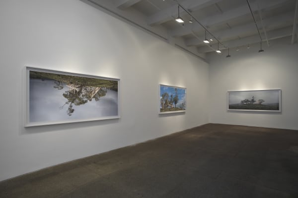 scene at a disorienting size and vantage point. All three works reference traditional European landscape paintings while disrupting their conventionally harmonious duality between culture and nature.